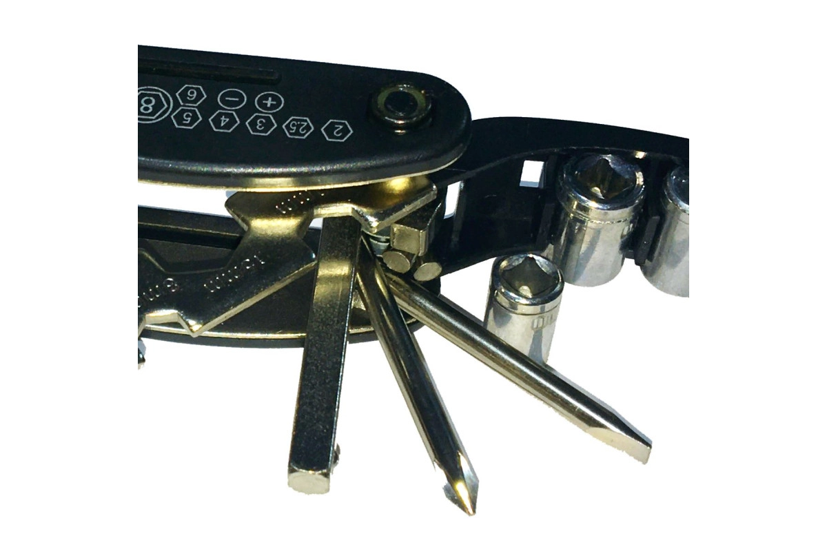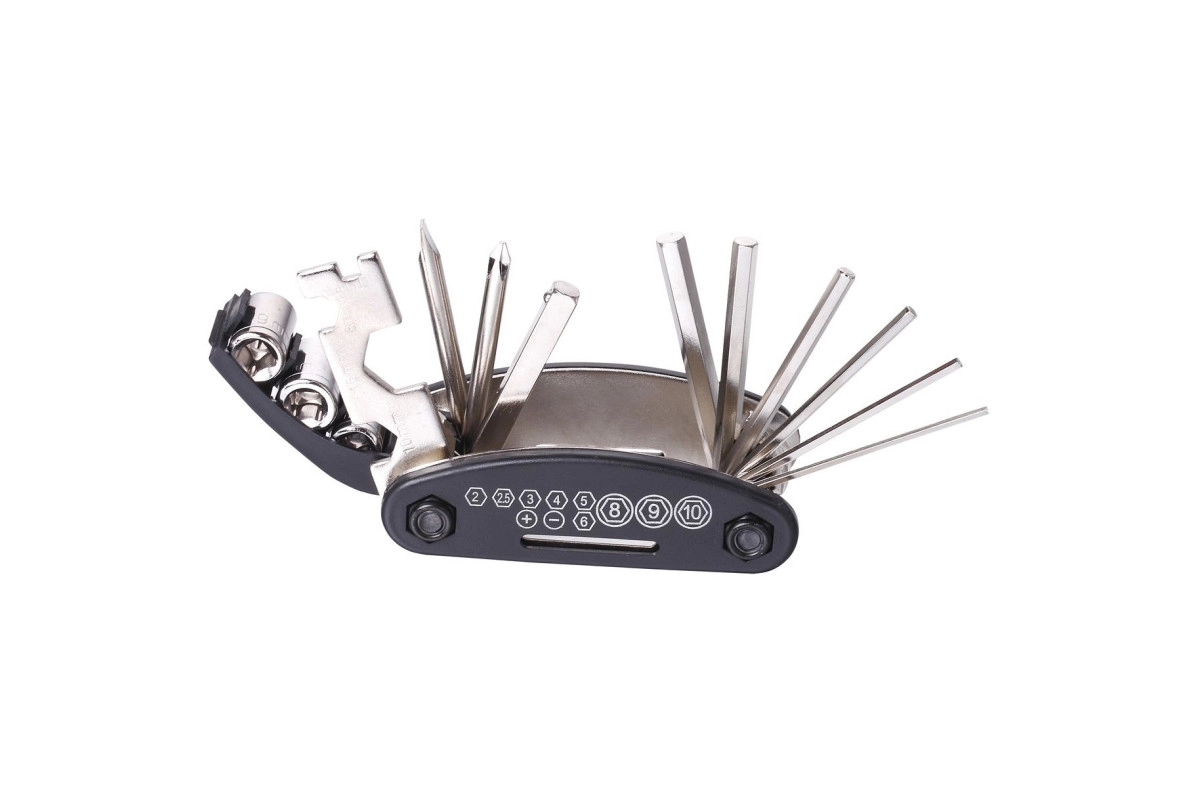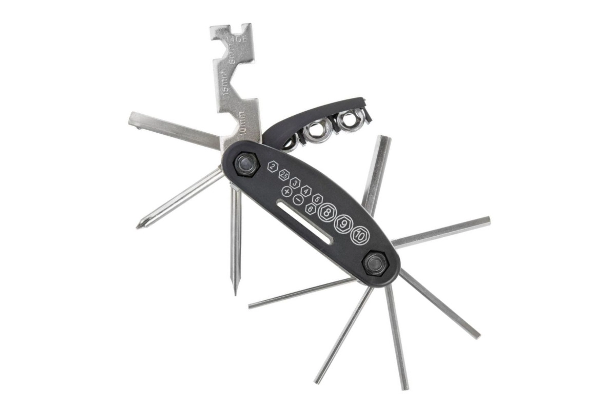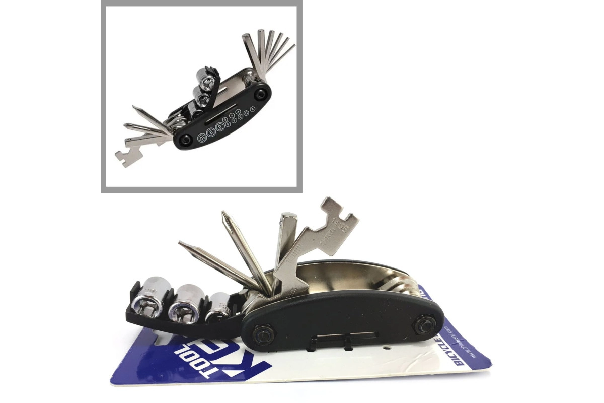 Комплекта инструментов достаточно для выполнения мелкого ремонта и регулировок велосипеда прямо в дороге. В набор входят шестигранники №2,5/3/4/5/6/8, отвертки под крест и шлиц, торцевые головки, накидные ключи и бортировка. Все элементы выполнены из прочной стали, что гарантирует долговечность и надёжность даже при регулярном использовании.