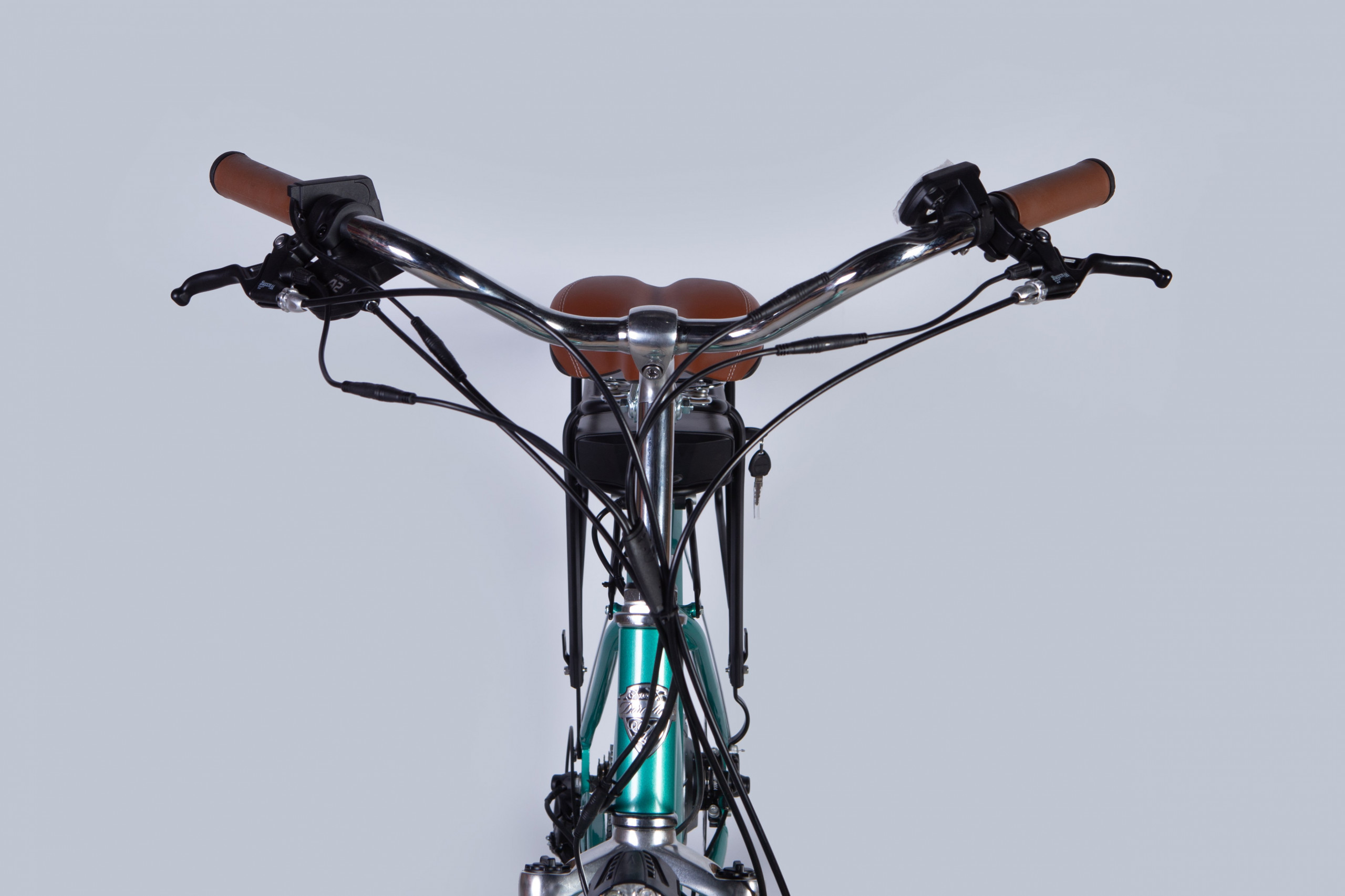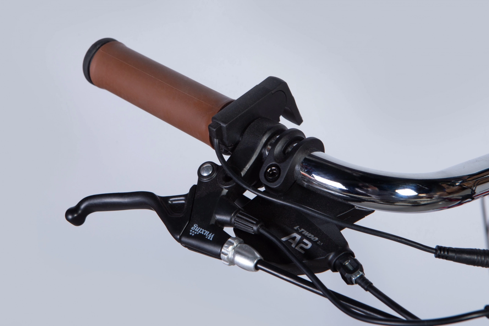 Живлення забезпечує велика батарея 12.5 А·год, встановлена на багажнику. Це зручне рішення, яке спрощує доступ до акумулятора та дозволяє легко знімати його для зарядки. Загальна енергоємність — 600 Вт·год, чого вистачає до 60 км пробігу в комбінованому режимі PAS + газ. Керування електротягою комбіноване: велосипед можна крутити педалі з підтримкою або їхати на повному газі.