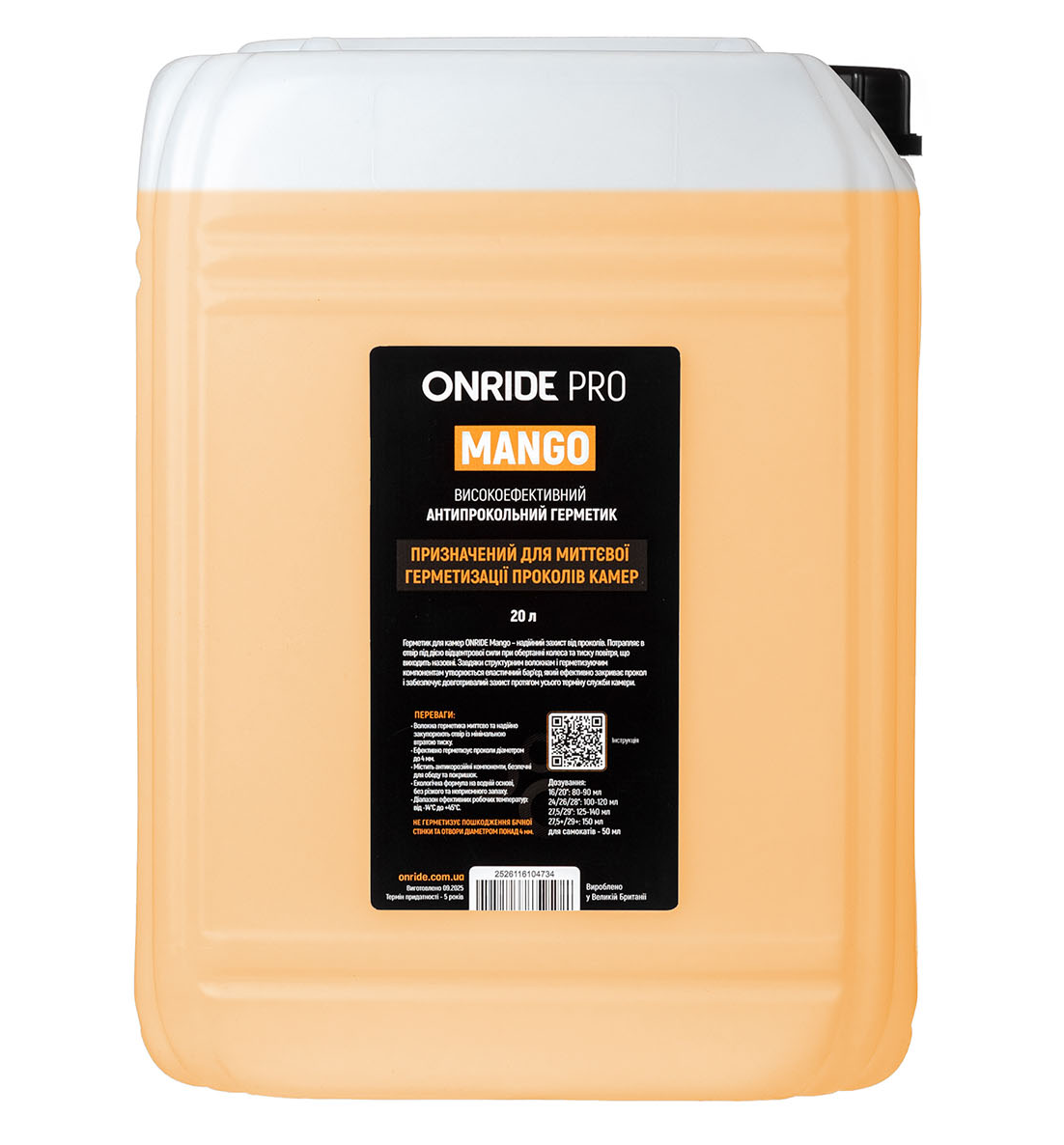 Герметик для камер ONRIDE Mango 20 літрів це професійне рішення для веломайстерень, сервісних центрів та прокатних пунктів. Такий об’єм забезпечує максимально вигідне використання та дозволяє обслуговувати сотні камер.