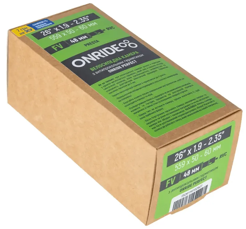 Камера ONRIDE з герметиком ONRIDE Perfect розроблена для велосипедів з діаметром коліс 26 дюймів і шириною покришок 1.9–2.35 дюйма. Вона оснащена клапаном Presta (FV) довжиною 48 мм, що забезпечує легке накачування і міцну герметичність. Завдяки інтегрованому герметику камера автоматично заповнює невеликі порізи і проколи, дозволяючи продовжувати поїздку без втрати повітря.