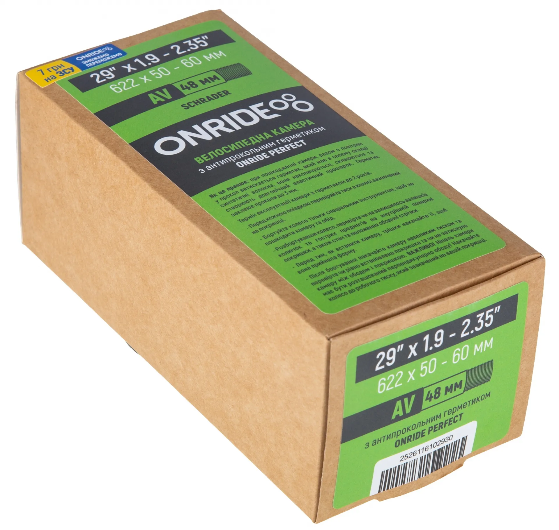 Камера ONRIDE з герметиком ONRIDE Perfect розроблена спеціально для 29-дюймових велосипедів, забезпечуючи високу функціональність на дорозі та поза нею. Діаметр 622 мм й ширина 50-60 мм (1.9-2.35″) роблять її сумісною з більшістю гірських та гоночних велосипедів. Довжина ніпеля 48 мм дозволяє без проблем встановлювати камеру разом з різними ободами.
