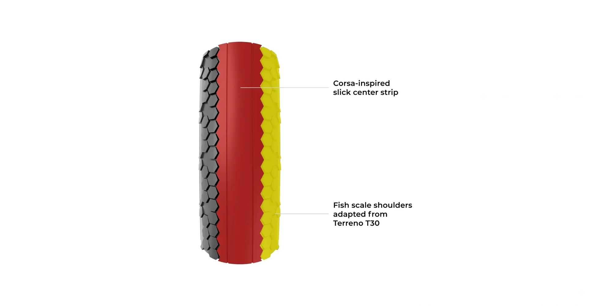 - Сликова центральна доріжка протектора, натхненна Vittoria Corsa, забезпечує відмінний накат, а бічні частини з малюнком “луска”, запозичені у Vittoria Terreno T30, забезпечують додаткове зчеплення в поворотах і при їзді по мокрій або сипучій поверхні;