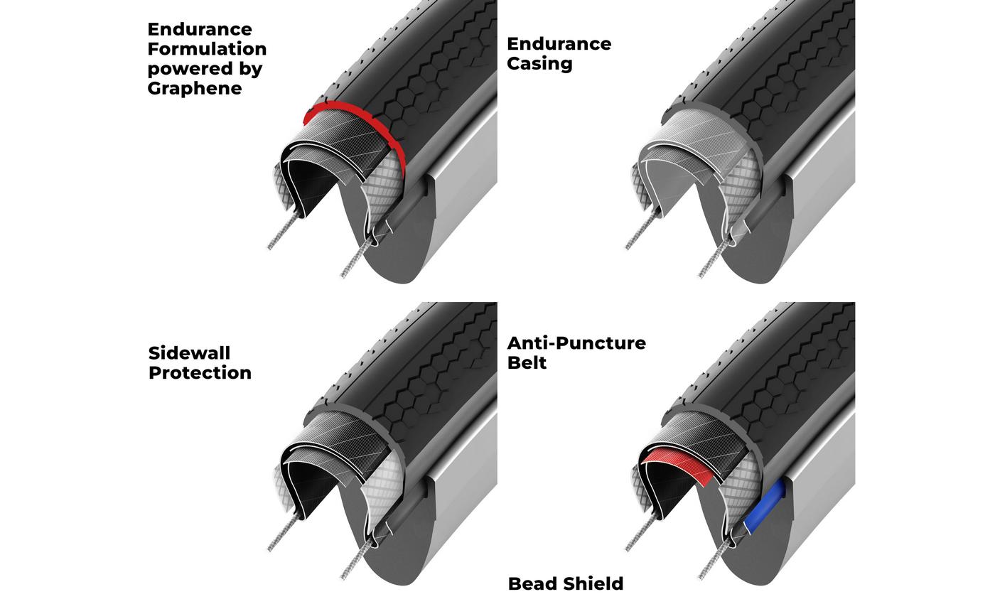 - Компаунд Endurance Formulation забезпечує максимальну міцність, зчеплення та довговічність, ця вдосконалена гумова суміш збагачена графеном для підвищення ефективності в широкому діапазоні умов. Створена для надійності в будь-яких погодних умовах та використання на далекі відстані, вона забезпечує стабільне зчеплення та ефективність;