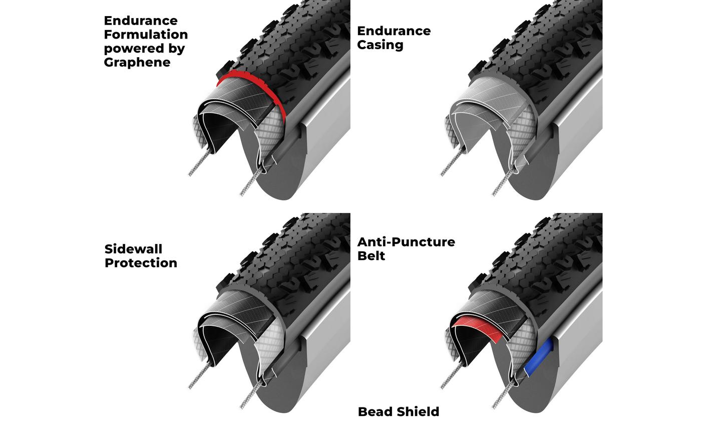 - Каркас Endurance, виготовлений з нейлону щільністю 100 TPI, створений для суворих умов їзди по гравію. Міцні нитки знижують опір коченню, зберігаючи чуйність та поглинаючи нерівності траси, забезпечуючи додатковий комфорт та контроль на нерівній поверхні;
