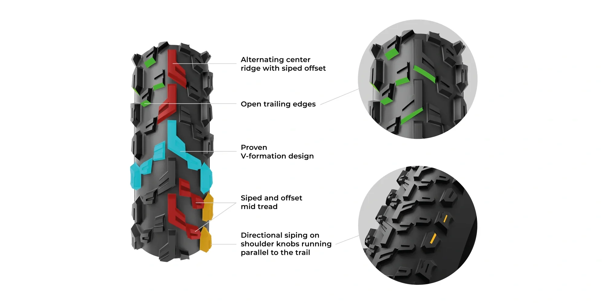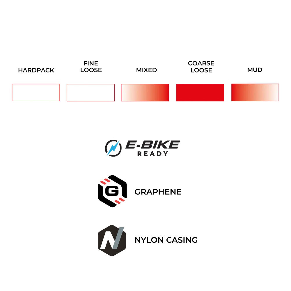 Центральна частина протектора, що швидко котиться, забезпечує прискорення на прямих, у той час як агресивні бічні блоки і глибокі прорізи надають контроль і впевненість у поворотах, пропонуючи виняткове зчеплення на технічній місцевості. Покришка може використовуватися без камери та сумісна з безкрючковими безкамерними ободами.