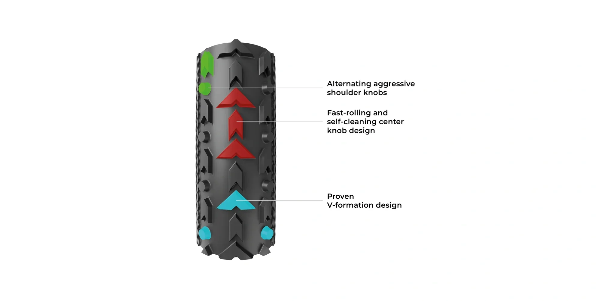 - Упевнене зчеплення на пересіченій місцевості та на грубому пухкому ґрунті завдяки агресивним бічним блокам, які вгризаються в ґрунт, не жертвуючи контролем чи чуйністю;