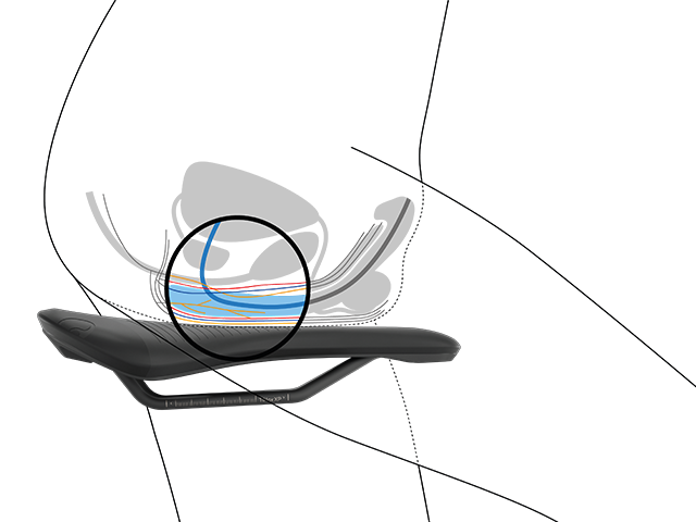 З урахуванням зміщеного назад центра тиску канал розвантаження в передній частині сідла виконаний м’яким, а в середній і задній — більш вираженим. Це забезпечує цілеспрямоване зняття тиску з промежини. Невеликий отвір у задній частині каналу покращує розвантаження без необхідності повного вирізу й жорсткої основи. Таке рішення ефективно знижує тиск і запобігає онімінню.