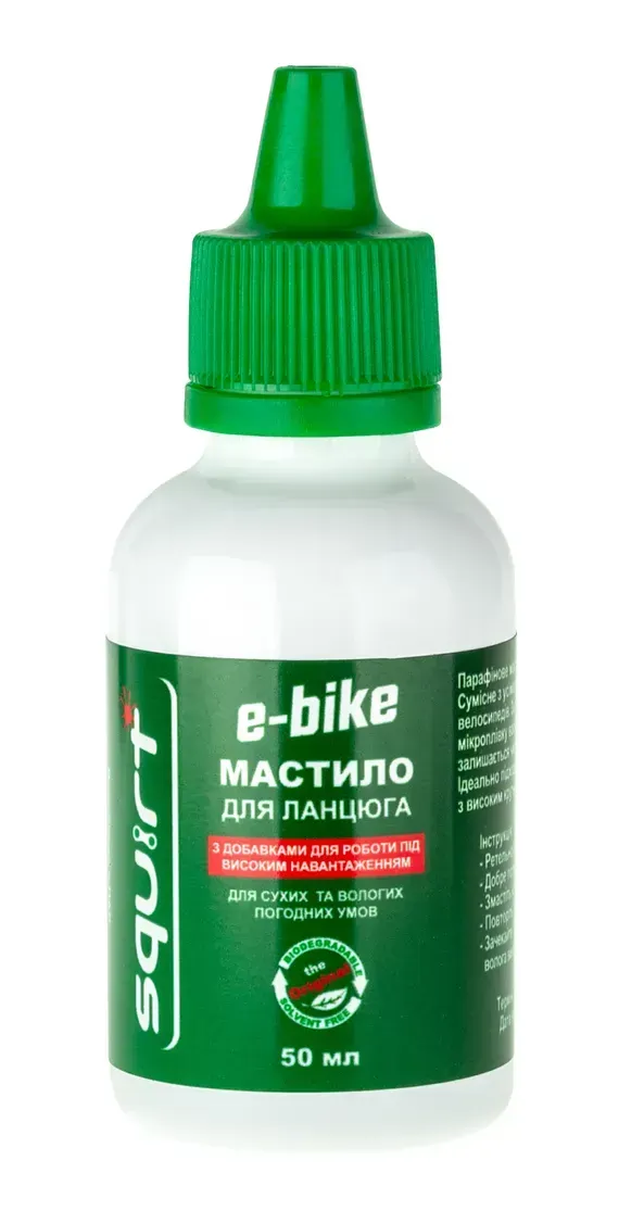 Це мастило для велосипедного ланцюга в якому використовується та ж перевірена технологія біорозкладається емульсії воску і води, що і в звичайній мастилі Squirt Chain Lube. Вона посилена спеціальними модифікаторами тертя під високим тиском. Нове мастило для ланцюгів Squirt e-Bike Chain Wax трохи гладкіше, ніж звичайне мастило для ланцюгів Squirt. Витримує більш високий тиск моменту, що крутить, і прослужить довше в умовах мокрої їзди.