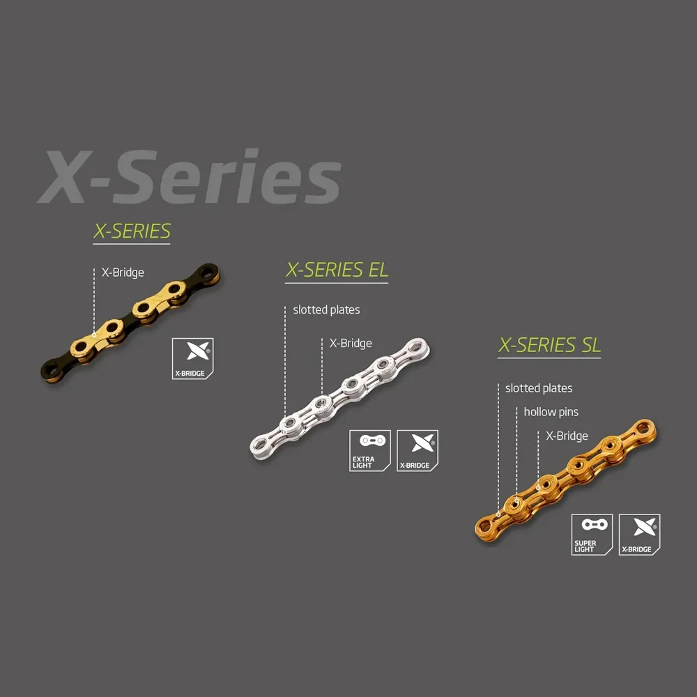 Серія KMC X була розроблена з урахуванням особливостей систем Shimano, SRAM та Campagnolo. Завдяки точно скошеним пластинам технологія X-Bridge забезпечує ідеальне перемикання та плавний хід у будь-яких ситуаціях їзди. Ця серія користується довірою багатьох провідних спортсменів у професійному велоспорті.